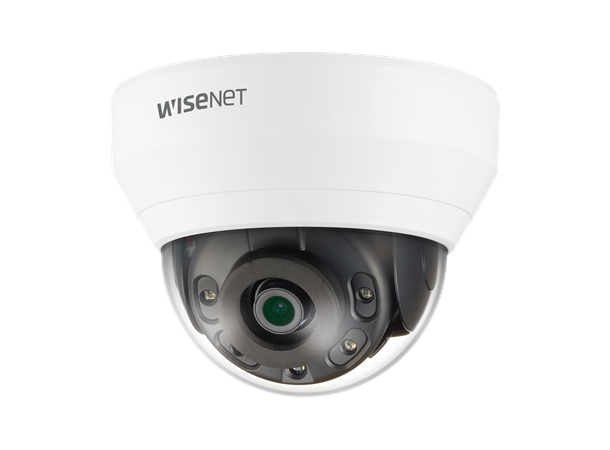 Wisenet Q network IR outdoor vandal dome camera, 5MP @30fps, 2.8mm fixed lens (104.7°), triple codec H.265/H.264/MJPEG with WiseStream II, Multiple streaming, 120dB WDR, Auto Day & Night (ICR), IR viewable length 20m, Advanced Video Analytics, Hallway View, Motion detection, LDC (Lens Distortion Correction), SD/SDHC/SDXC slot, CVBS for easy installation, IP66, IK10, PoE