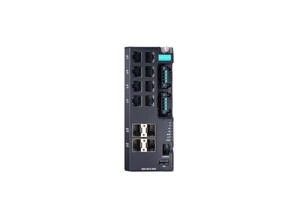 Managed Gigabit Ethernet switch with 8 10/100BaseT(X) ports, 4 10/100/1000BaseT(X) or 100/1000BaseSFP ports, dual power inputs 12/24/48 VDC, -40 to 75°C operating temperature