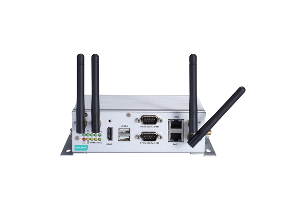x86 embedded computer with Intel Atom® E3845 processor, 4 GB RAM, 1 HDMI port, 2 Ethernet ports, 2 serial ports, 4 DIs, 4 DOs, 1 USB 3.0 port, 2 USB 2.0 ports, 1 SD slot with 16 GB card preinstalled, 1 mSATA slot with 32 GB preinstalled, 1 uSIM slot, 1 Wi-Fi Mini PCIe slot, 1 3G/LTE Mini PCIe slot, 5 wireless SMA connectors, Linux Debian 8 preinstalled, -40 to 70°C operating temperature